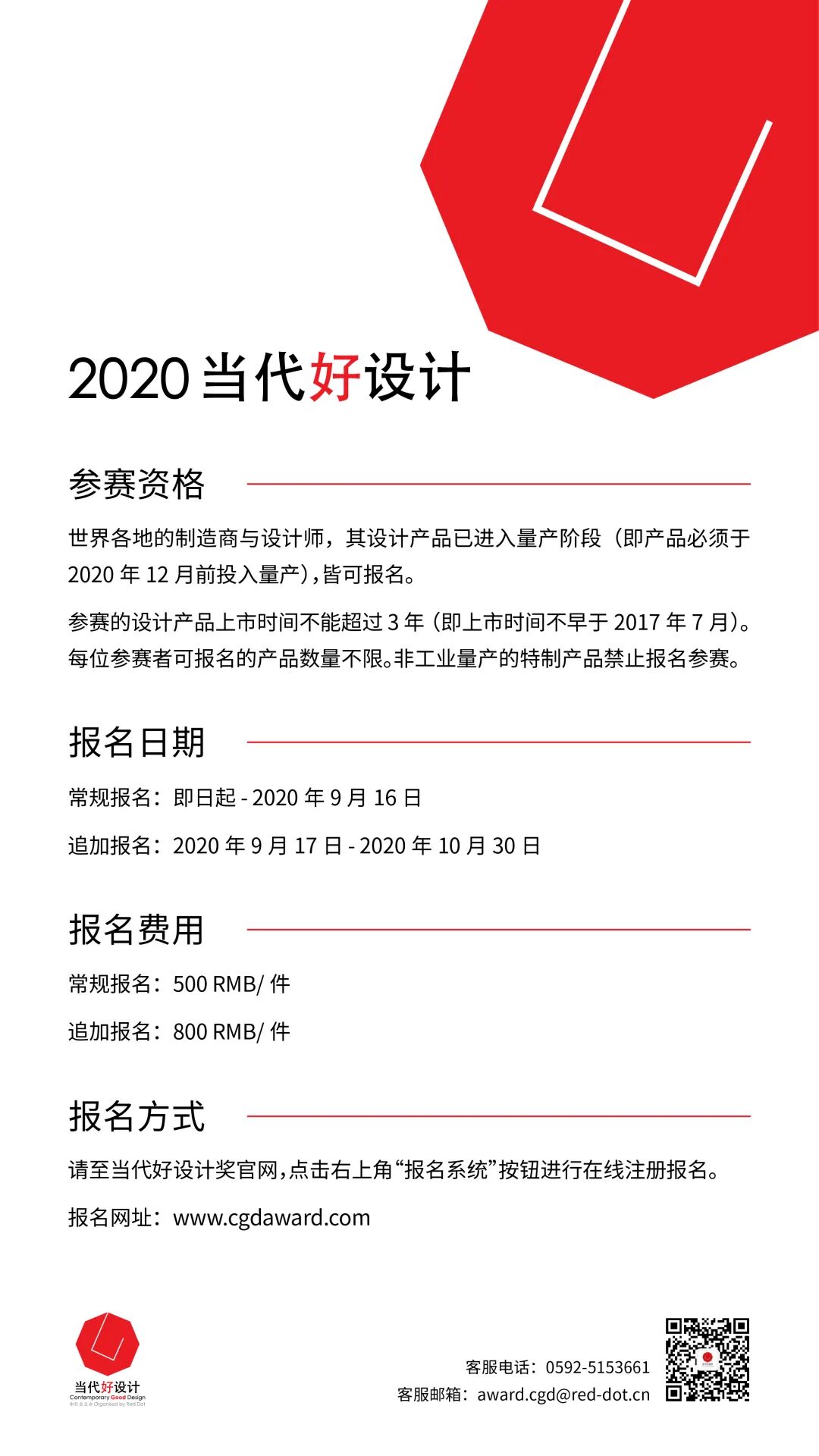 2020年7月10日,当代好设计奖正式启动新一年度的全球征件,世界各地的制造商与设计师,其设计产品已进入量产阶段(即产品必须于2020年12月前投入量产)皆可报名参赛!